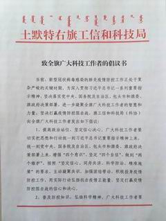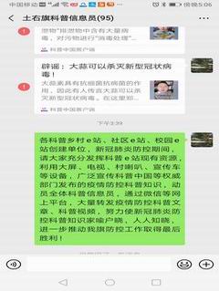 新冠肺炎疫情防控工作开展以来,土右旗工信和科技局(科协)面对公众科普需求,自觉担当作为,充分发挥科普联席会议办公室职能,组织全旗各乡镇、科普成员单位,团结带领广大科普志愿者、科技工作者,发挥科普工作主力军作用,采取“互联网+科普”等措施,扩展科普工作深度和广度,下功夫做好社区居民、农民群众“最后一公里”的科普服务,引导广大群众科学防控新冠肺炎疫情,增强疫情防控的科学性和有效性,用科学击碎谣言,让理性之光照亮疫情防控之路。