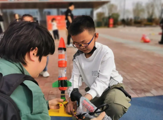 王斌老师带着孩子们和家长在万科城广场上共同完成了水火箭的实践发射.