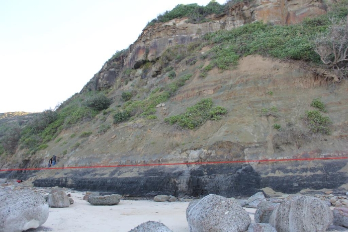 澳大利亚悉尼盆地北缘的生物灭绝层位(红线所示)。(沈延安课题组供图)