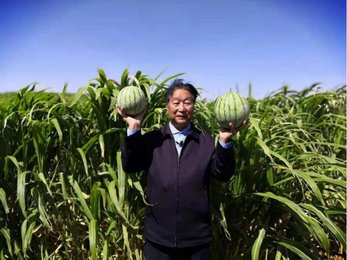 林占熺在内蒙古阿拉善菌草治沙基地察看农作物生长情况