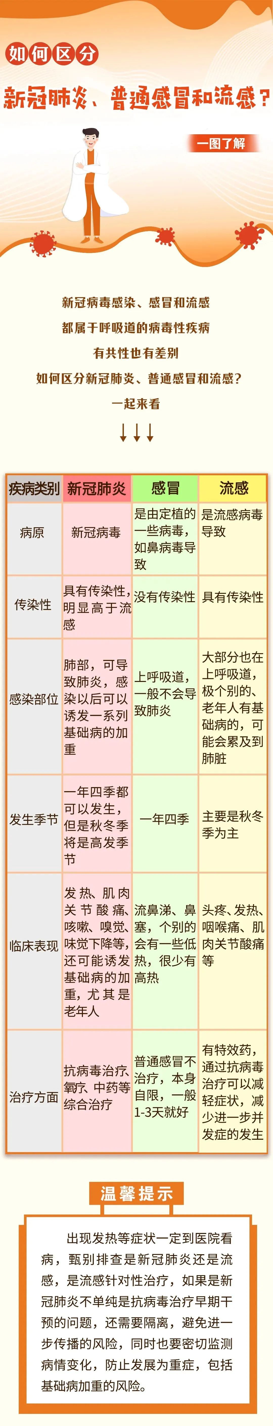 新冠肺炎、普通感冒和流感有啥区别?一图看懂