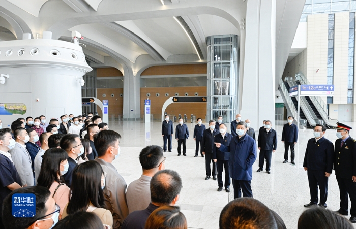 5月10日,中共中央总书记、国家主席、中央军委主席习近平在河北省雄安新区考察,并主持召开高标准高质量推进雄安新区建设座谈会。这是10日上午,习近平在雄安站考察。新华社记者 李学仁 摄