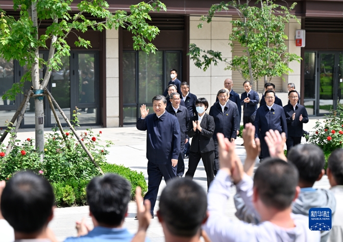 5月10日,中共中央总书记、国家主席、中央军委主席习近平在河北省雄安新区考察,并主持召开高标准高质量推进雄安新区建设座谈会。这是10日上午,习近平在容东片区南文营社区考察时向社区居民挥手致意。新华社记者 殷博古 摄