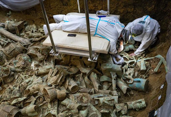 在位于四川广汉的三星堆遗址8号“祭祀坑”,8号“祭祀坑”发掘负责人、北京大学考古文博学院副教授赵昊(左)与考古工作者任俊锋一起清理铜神坛(2022年6月1日摄)。