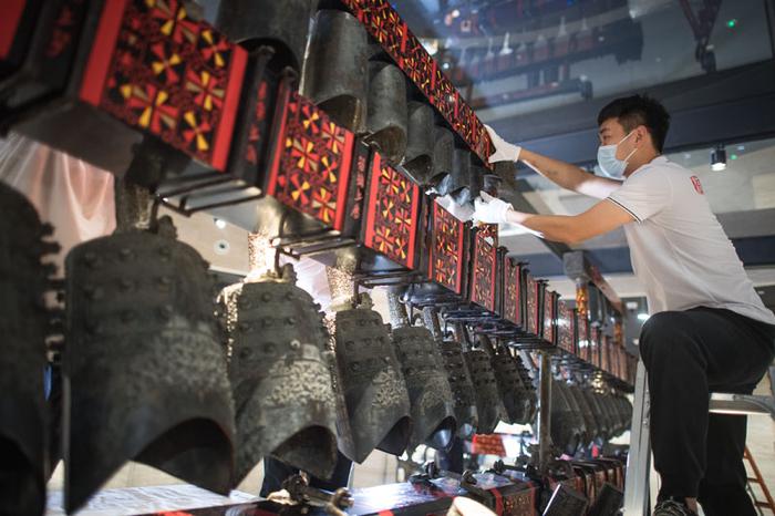 湖北省博物馆工作人员对曾侯乙编钟进行调试安装(2021年10月15日摄)。