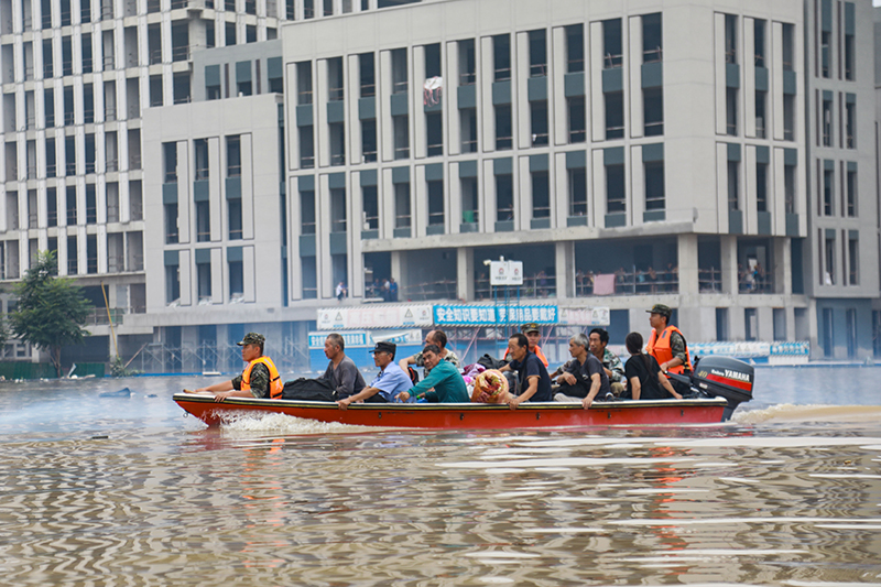 救援人员在河北省涿州市市区乘坐冲锋舟前去转移受灾群众(8月2日摄,无人机照片)。