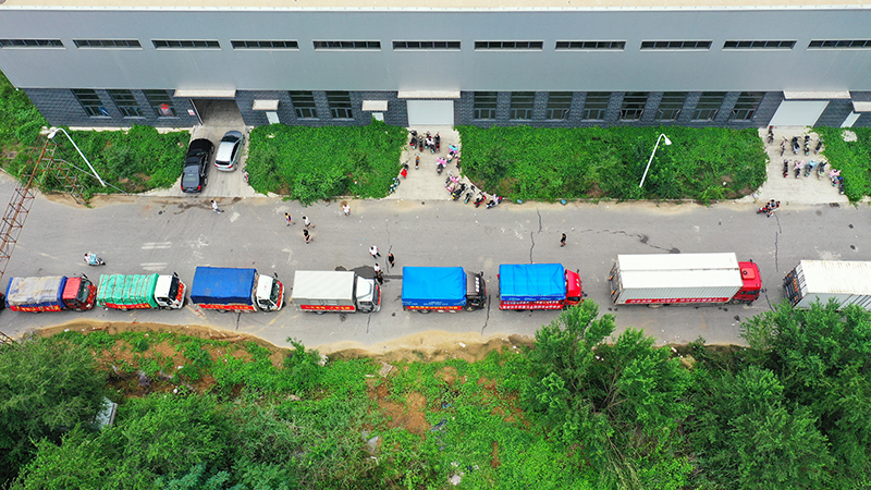 在河北省涿州市钢研物资储备点外,运送物资的车辆排起长队(8月5日摄,无人机照片)。