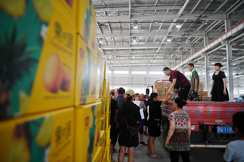 工作人员和志愿者在河北省涿州市钢研物资储备点内将捐赠物资装车外运(8月5日摄)。