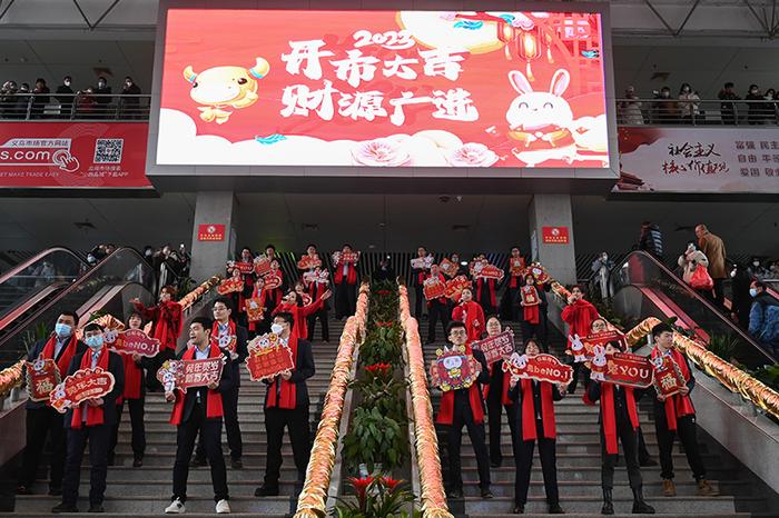 商户代表在义乌国际商贸城的大厅进行文艺表演(2023年2月2日摄)。