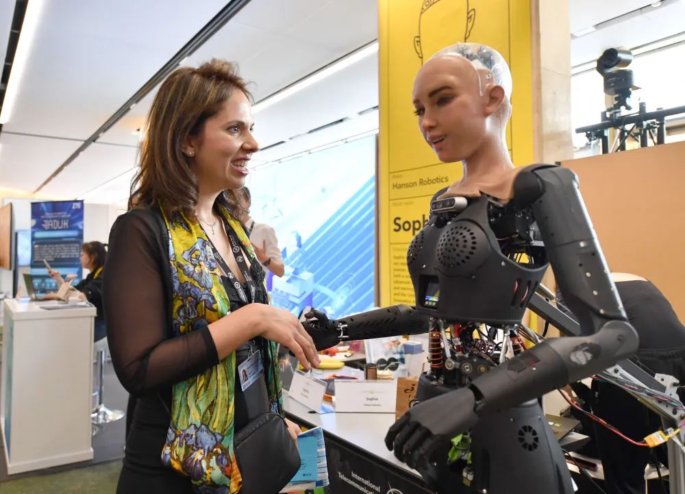 2023年7月7日,在瑞士日内瓦“人工智能造福人类全球峰会”上,一名参会者与仿真机器人索菲亚互动。(新华社记者连漪摄)