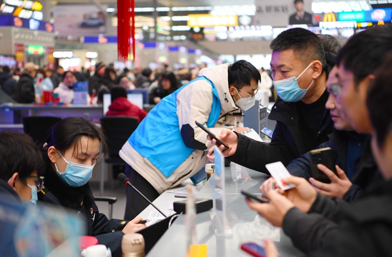 在郑州东站候车大厅“心馨”党员服务台,旅客在咨询乘车事宜(2024年2月1日摄)。新华社记者 郝源 摄