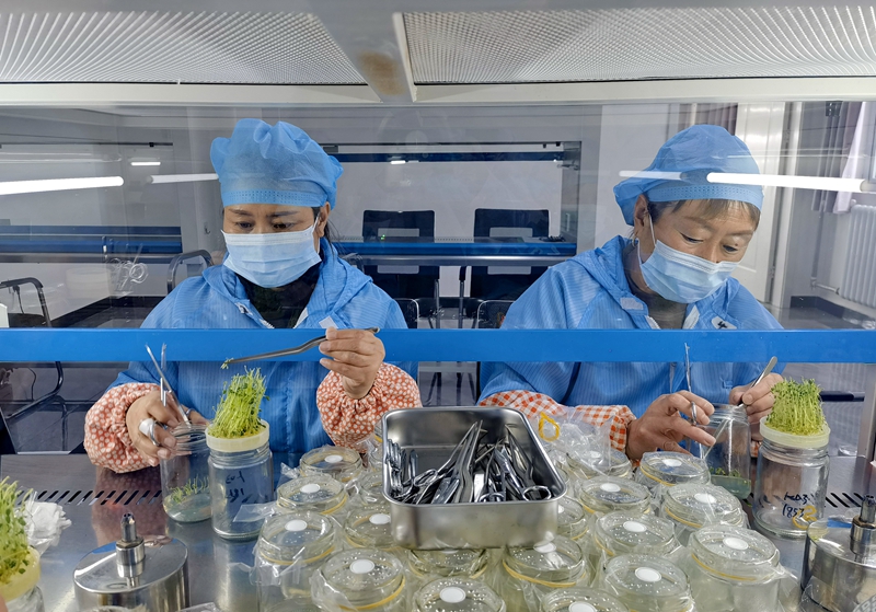技术人员在河北省张家口市德胜村一处育种室内培育微型马铃薯瓶苗(2024年2月4日摄)。新华社发