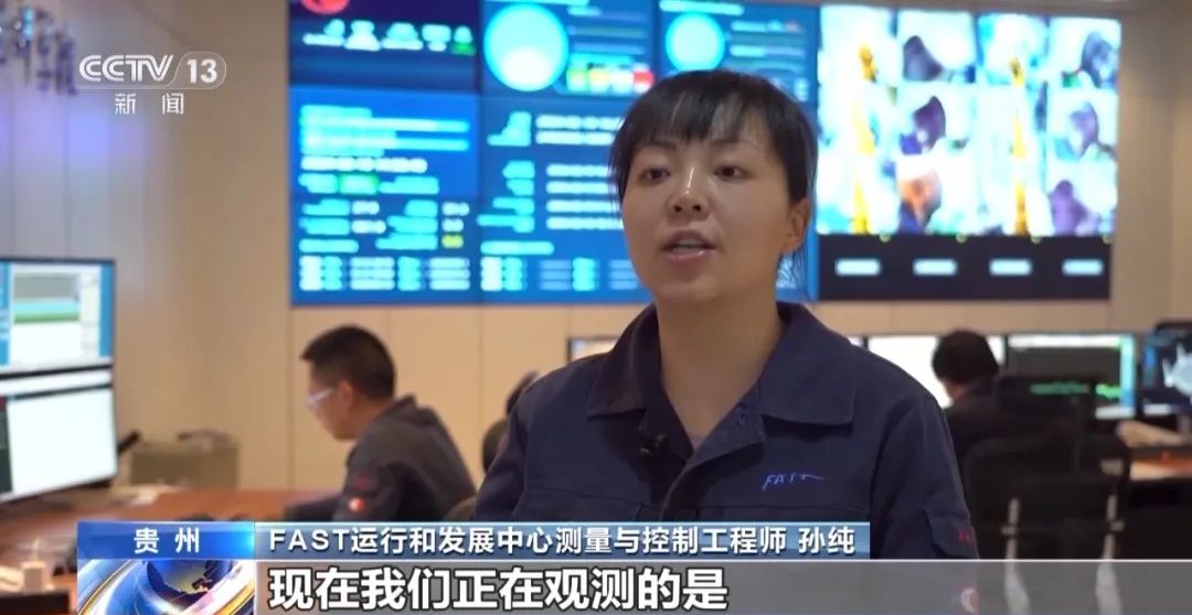 FAST运行和发展中心测量与控制工程师 孙纯:现在我们正在观测的是叫脉冲星的搜寻。我们和平时是一样的,24小时值班,保证我们的望远镜正常运行。包括我们现场的维护人员,每天都要进现场去查看望远镜的状态,保证它是处于一个良好的状态,然后去接收我们的天体信号。